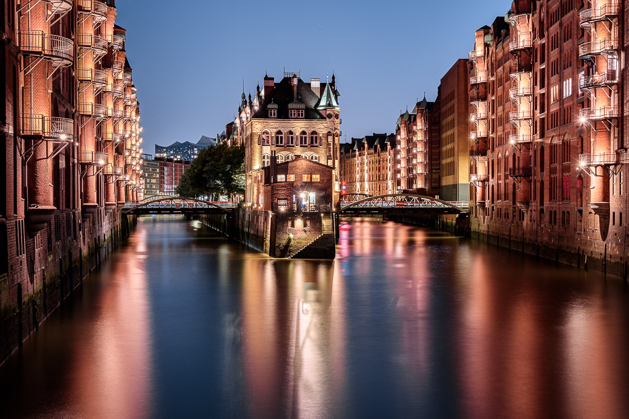 Das berühmte Hamburger Wasserschloss in der abendlichen Blauen Stunde